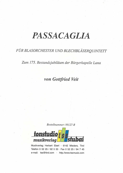 Ihre Uraufführung erlebte diese "Passacaglia" für großes Blasorchester und Blechbläserquintett von Gottfried Veit am 03. März 2007 durch die Bürgerkapelle Lana – unter der Leitung von Hans Obkircher – im großen Meraner Kursaal.